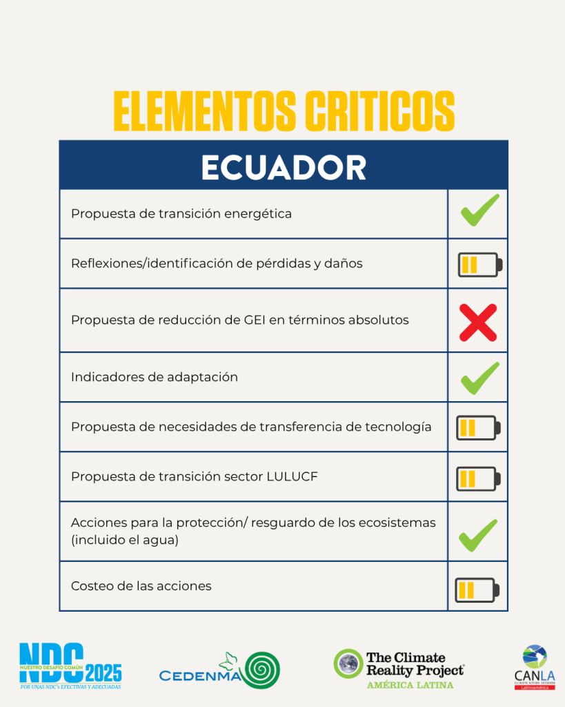A diferencia de lo que inicialmente se había considerado como una ausencia total de elementos críticos, el análisis actualizado muestra que la Segunda NDC de Ecuador incorpora de manera parcial o completa la mayoría de ellos, por lo que su calificación se ajusta a aceptable.
